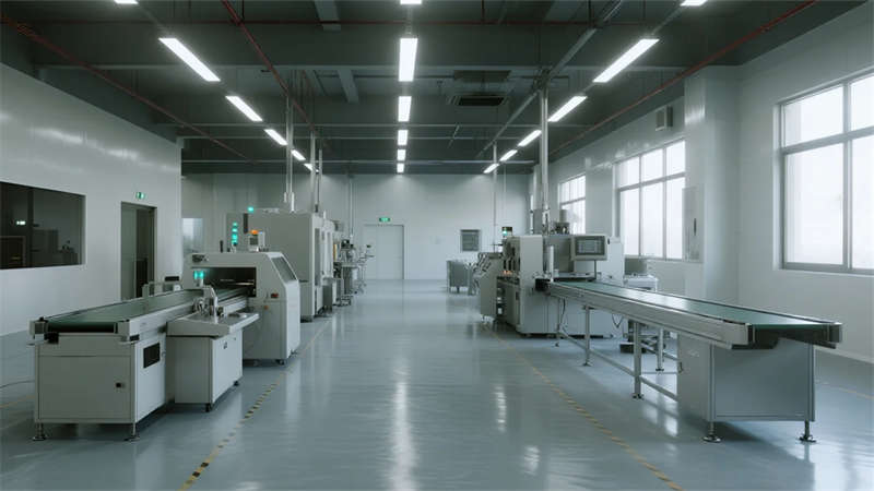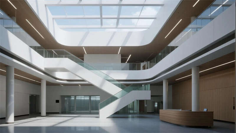 空間內(nèi)核強調(diào)人性化體驗:挑高中庭以懸浮樓梯創(chuàng)造輕盈動線,屋頂花園成為員工觸摸自然的窗口;無柱車間與智能實驗室展現(xiàn)工業(yè)精密感,而木格柵連廊與綠植墻則注入人文溫度。夜幕降臨時,建筑化為光影容器,冷白光帶勾勒結(jié)構(gòu)輪廓,暖黃窗格透出工作場景的活力。
