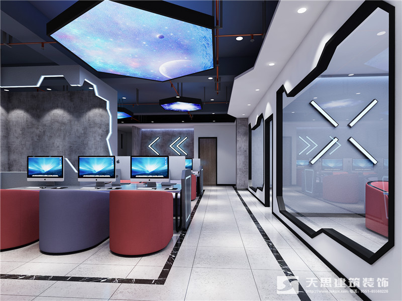 根據業主的要求,網咖設計的整體顏色以淺色為主,中間穿插對比強烈的撞色系來展現效果。