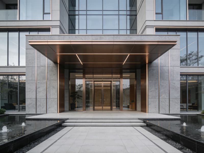 本設(shè)計(jì)秉持“簡(jiǎn)約輕奢,旅居雅境”的理念,為4000平酒店打造高品質(zhì)空間。外觀采用淺灰色石材與通透玻璃搭配,輔以金屬線(xiàn)條勾勒,簡(jiǎn)潔大氣又具時(shí)尚感。入口設(shè)挑高門(mén)廊,搭配旋轉(zhuǎn)門(mén)與迎賓水景,營(yíng)造出尊崇的入戶(hù)體驗(yàn)。