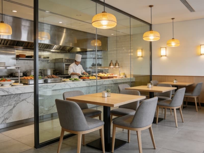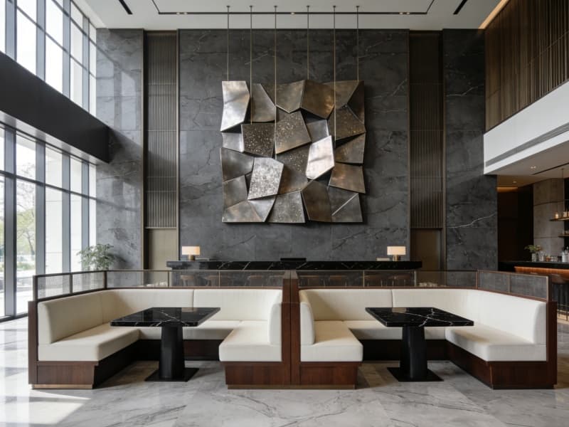 酒店一層為公共區(qū)域,大堂地面鋪淺灰色大理石,前臺(tái)背景墻以巖板結(jié)合藝術(shù)裝置,彰顯格調(diào)。大堂吧設(shè)半私密卡座,供客人休憩交流。全日制餐廳配備開(kāi)放式廚房,可讓客人直觀感受美食制作過(guò)程。